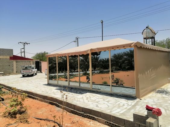 تركيب خيام حيث كل خيمة تكون عبارة عن هياكل مستقل من التيوبات والمواسير حديدية يتم تفصيلها لتصميم الهيكل بطريقة مميزة.